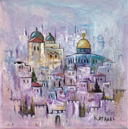 An artistic snapshot of Jerusalem’s Old City featuring the Dome of the Rock and the Church of Holy Sepulchre in lilac hues.