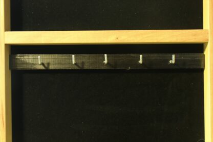 The box has an olive-wood look and its interior has two shelves (bottom ledge and an upper shelf) and hooks to hang keys from. The hinged door on the front has a side fastening and there are two metal clips on the back for hanging on a wall.