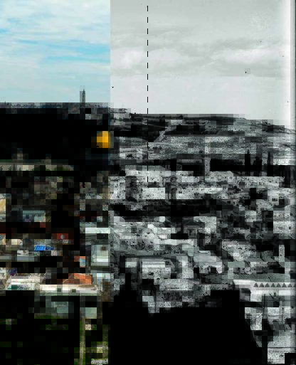 Jerusalem’s landscape as we know it today is merely a surface layer, a slice in a long tumultuous history that has continuously seen people and civilizations taking over from preceding ones. Over time, layers are obscured and sometimes obliterated to the point where one can find only a few traces or ruins. Superimposing an additional layer, a photograph taken today of the same location, onto that taken by the American Colony photographers some hundred years ago, shot from the same spot and the same angle, moves us between two distinct periods of time. It allows us to study the changes that have occurred, make comparisons, and align the physical transformations with the events that took place in the city and around the region during the last century.