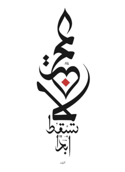 This original piece of handpainted Arabic calligraphy is a quotation from Corinthians: “Love never fails”. Written in Moroccan mojawhar jalil script, the design is in black ink and is signed by the artist.