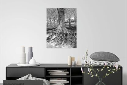The roots of an ancient olive tree in the Garden of Gethsemane, with the Old City in the background, depict Jerusalem’s history as a Holy City and the enduring nature of faith over the centuries. This canvas print is a reproduction of an original pencil drawing.