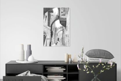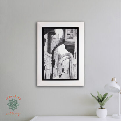 The Via Dolorosa marks the path taken by Jesus carrying his cross from the Antoniya fortress (the first station) to the site of his crucifixion, now the Holy Sepulchre Church. This canvas print shows the Via Dolorosa in 1905 and is a reproduction of an original pencil drawing.